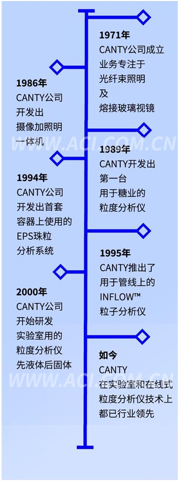 CANTY初次涉足粒子分析领域源于一次糖厂参观。当时,CANTY的金属玻璃熔接视镜已经在糖厂中糖结晶器上的人工观测孔得到应用。在糖厂中,CANTY的工程师注意到用户在CANTY的视镜上安装了一个来自静态显微镜的镜头,用于定期观测糖结晶器中生长中的糖晶体。从显微镜上拆下的镜头加上微弱的照明导致用户视野中所见的图像质量很差,但这为CANTY触发了一个灵感。数月之后,工程师带着CANTY的首台粒子监测摄像机回到了这家糖厂。这款产品的开发很大程度上依赖于CANTY在优化过程照明方面丰富的经验。CANTY初次将过程照明和显微级镜头相结合,效果十分显著。依赖这款产品,用户可以查看糖晶体生长的连续实时视频图像。视频图像涵盖了从最初的晶种阶段到完全生长的晶体状态的整个过程,使用户得以大幅度提高过程控制水平,进而提升过程产量。