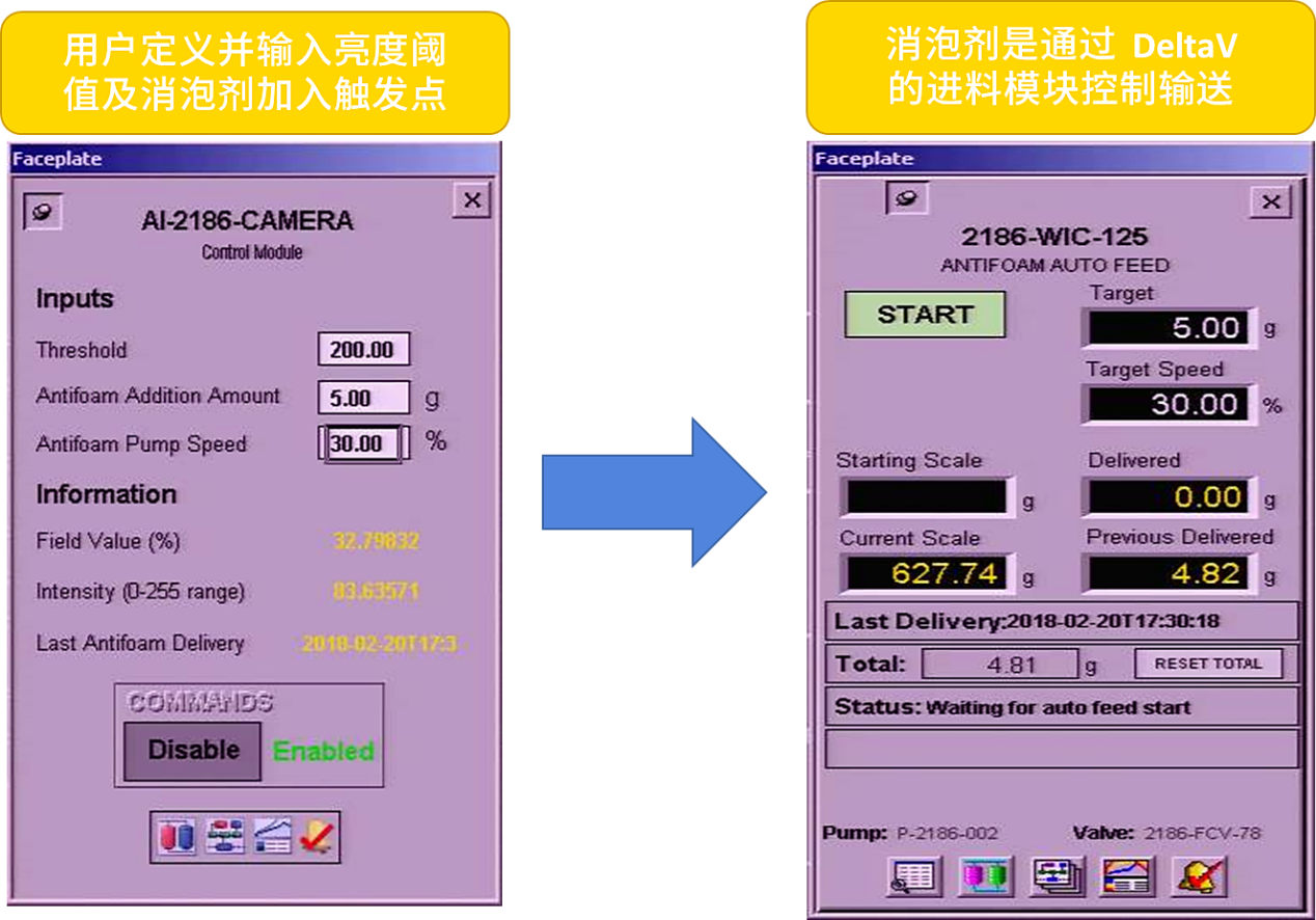 截图来自用户的控制系统。该用户控制系统显示泵排量时是反过来的,即:图上显示的紫线向下实际上代表泵排量的输出值上升。由图中可见当泡沫亮度达到200时,消泡剂泵按照设定产生了应有的反应。